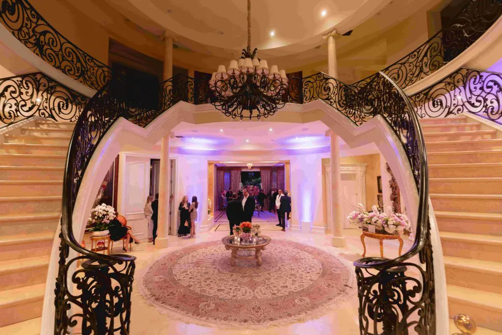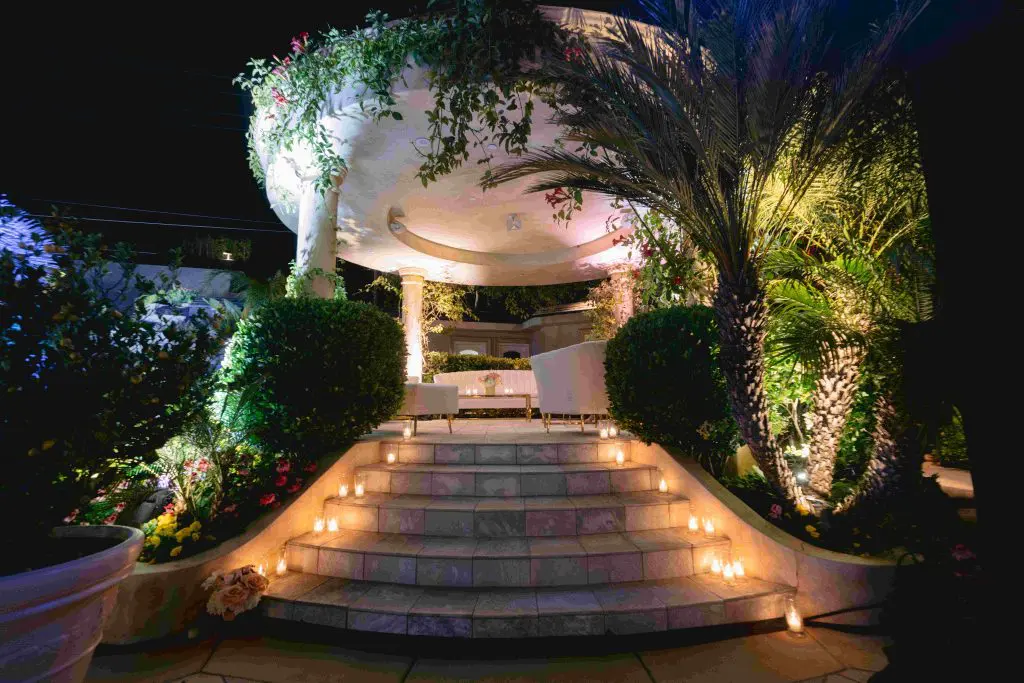 Alex and Jason signed their ketubah signing at their private residence. We set up white lounge furniture, round, and long rectangular tables with pink and white floral centerpieces in the backyard. Once, the sun went down and the rabbi arrived, the ketubah signing ceremony began. After the signing concluded, the party began. We had set up a black and white checkerboard dancefloor for the dancing.