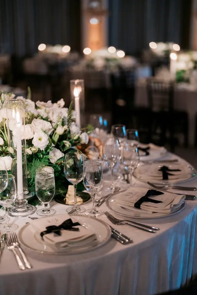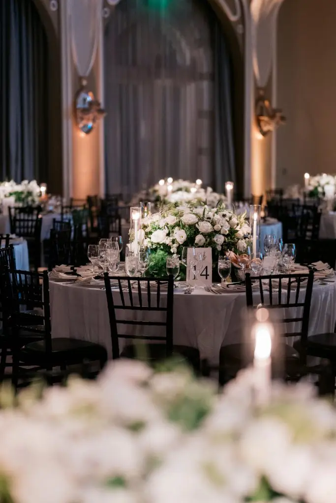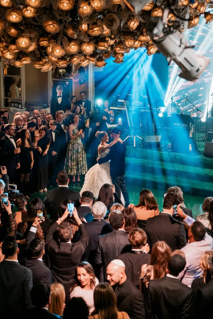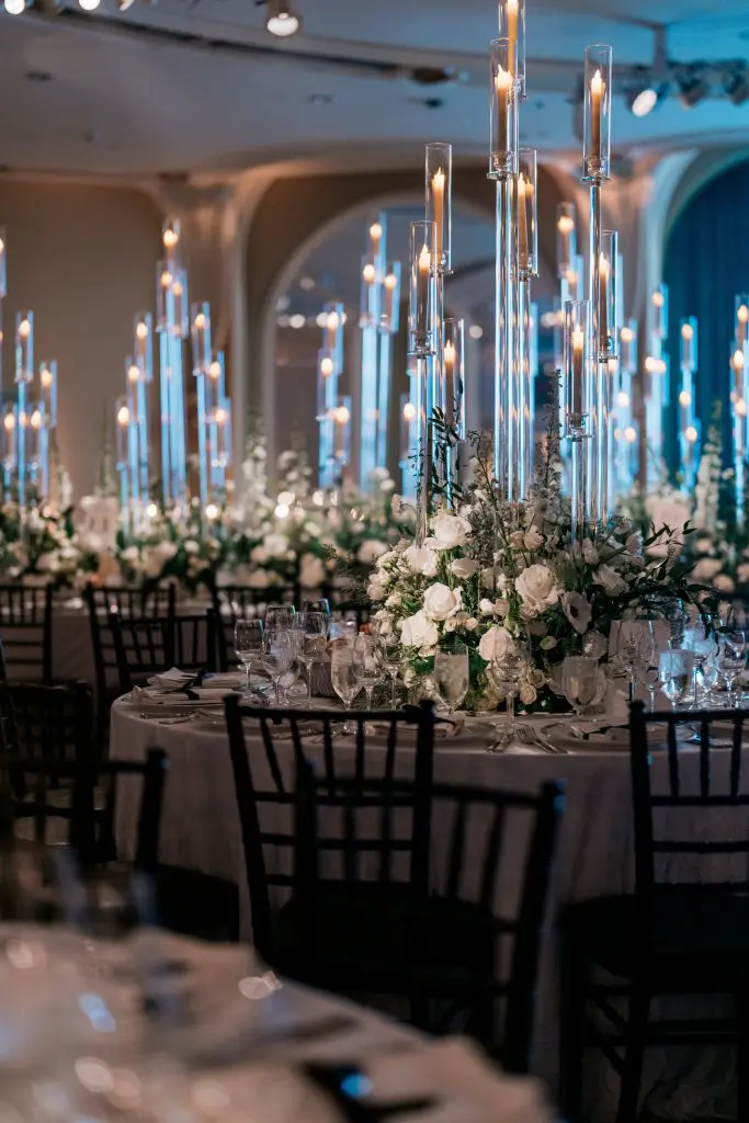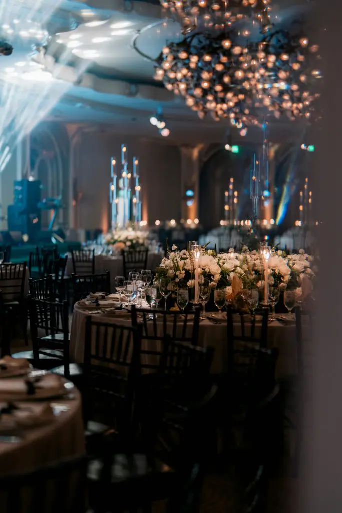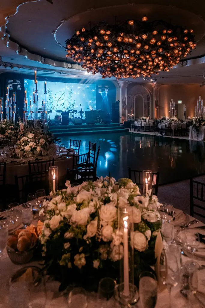 to relive the serene scene of the Crystal Lawn ceremony to the vibrant energy of the Crystal Ballroom at the Beverly Hills Hotel. Elegance in every detail. White and green hues set the mood, Grammy award guests and unforgettable vibes. Romantic evening under the glow of candelabras. Where music meets magic! An LED stage graced by Grammy award-winning talent.