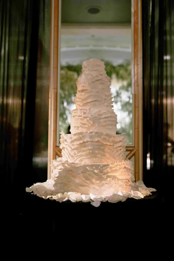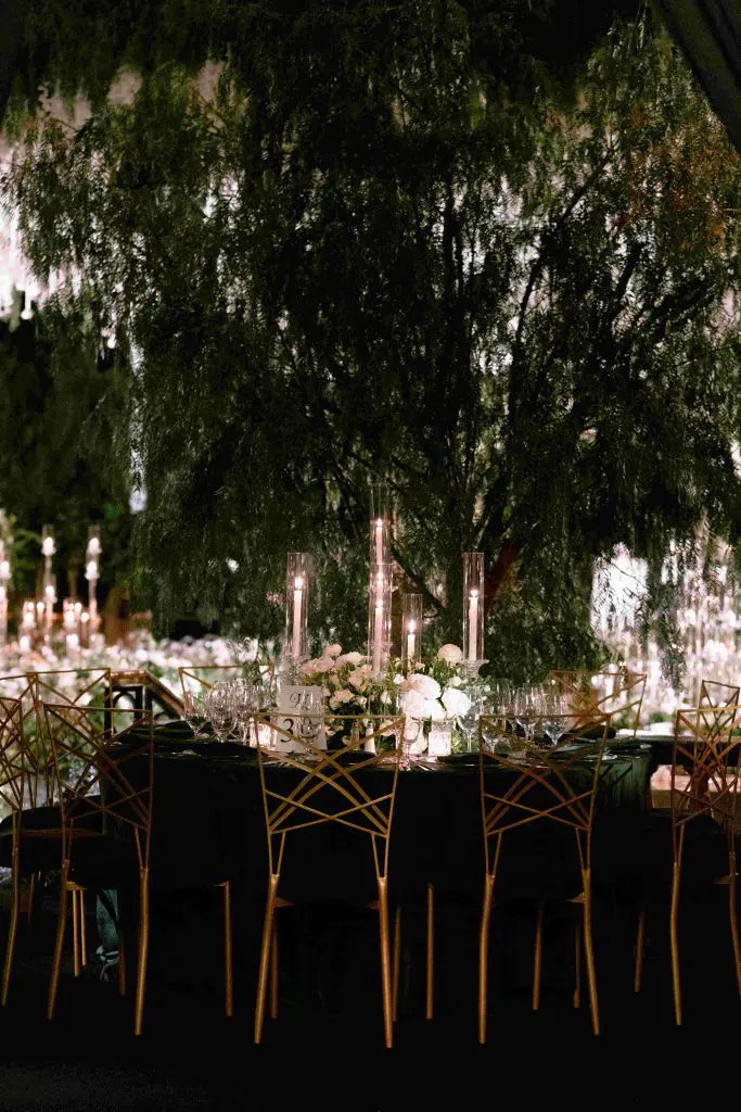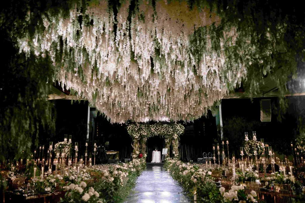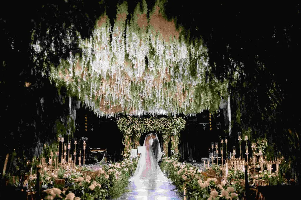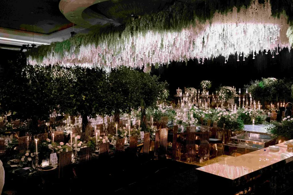 We made the ballroom look like a beautiful forest. We had flowers from the ceiling, and flowers, trees, and greenery almost everywhere you looked. The ceremony was held in the ballroom where we built a platform aisle in the middle. The tables were placed all around and there were a few rows of seats on both sides of the aisle in the front for people to sit in. After the ceremony we had a quick turnover to remove the platform aisle and rows of seats to make room for the dancefloor for the reception to begin. The quick turnover took around 10 to 15 minutes.