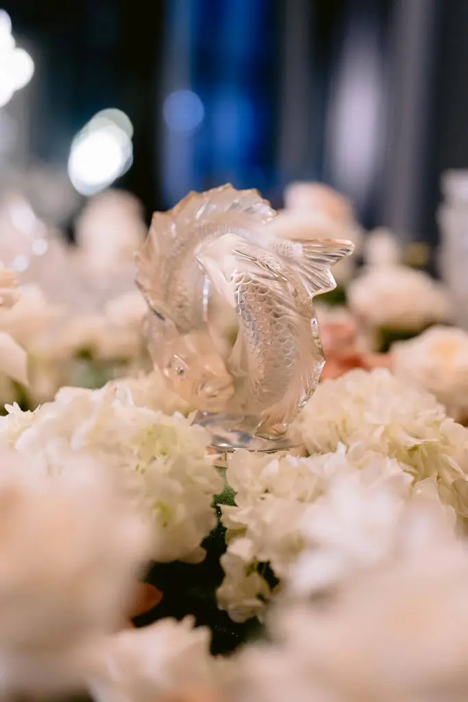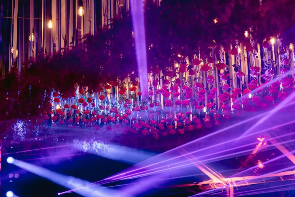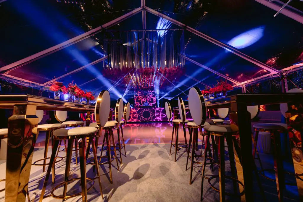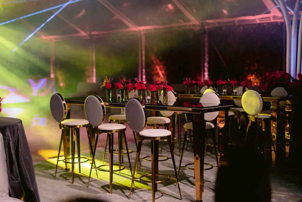 There were tall votives along each side of the staircase as you enter their home and there was a large rose butterfly to take photos in front of. The cocktail reception was held by the pool with some food stations and high cocktail tables. We tented part of the backyard for the party. We set up white carpeting and white furniture that surrounded the dancefloor and red rose arrangements throughout. We had red roses and purple feathery plants hanging from the ceiling of the tent over the dance floor. We set up a huge stage with LED panels and a big LED backdrop behind that had different designs throughout the evening.