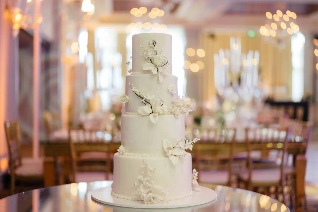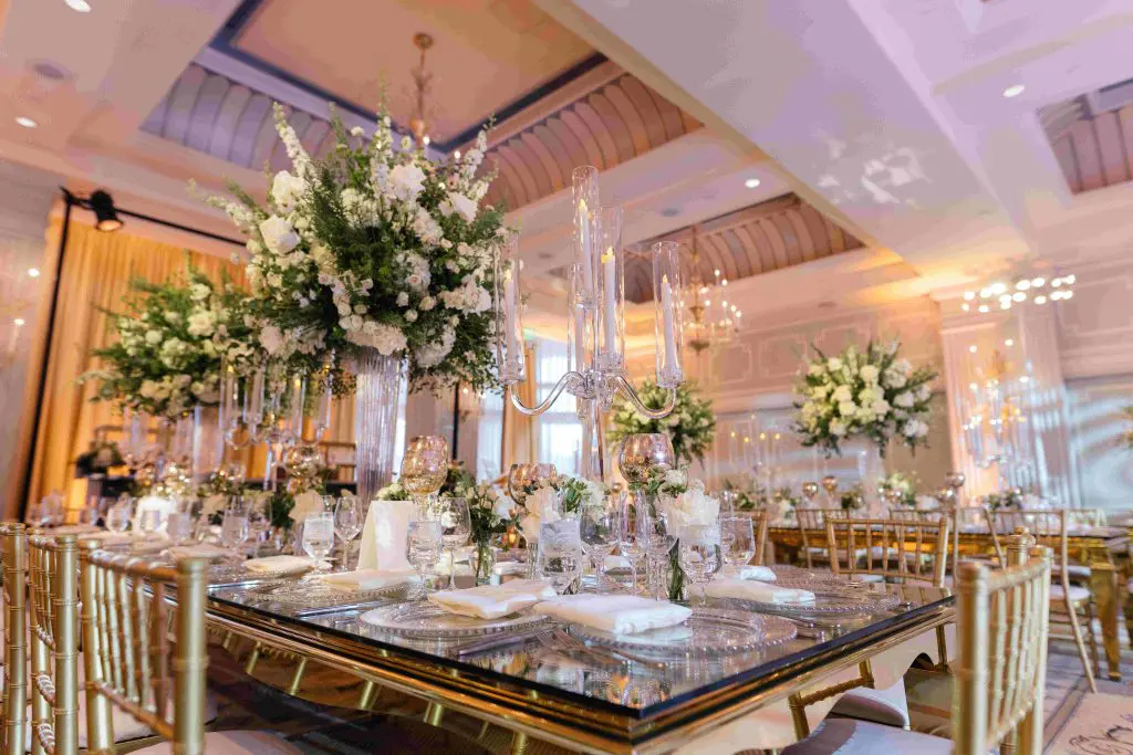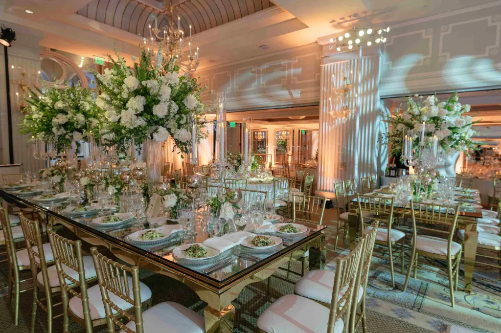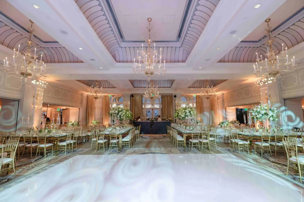 The ceremony took place right out front of the hotel property on the sand. We built shiny white flooring to be placed on the sand so the guests wouldn’t get sandy and dirty. There was a cocktail reception that took place on the patio right outside of the ballroom, overlooking the beach which had some food stations. The guests then made their way into the main ballroom for the reception. There were accents of gold and silver, large candelabras and beautiful tall floral centerpieces spread out along the rectangular tables. By doing this, it added great height and volume to the tables and ballroom. Everyone concluded the evening with delicious food, drinks, and dancing.